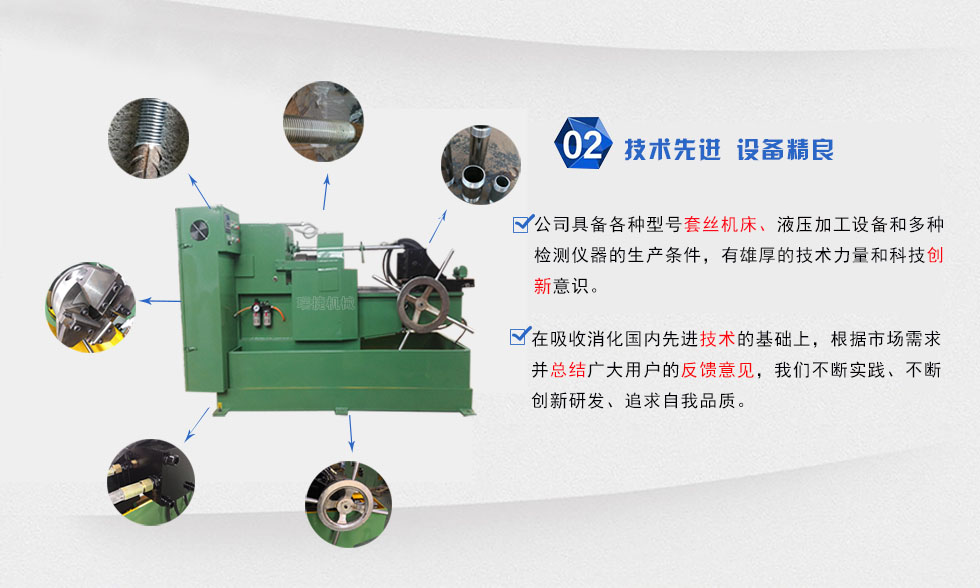 本套絲設(shè)備屬于無削加工設(shè)備,運(yùn)用特殊的切削技術(shù),上絲輕盈快捷,提高生產(chǎn)效率,采用三點一線,同心度高,性能穩(wěn)定等優(yōu)點,本機(jī)每分鐘可切削3-5根工件,速度快,效率高,對于一些不定長度的鋼結(jié)構(gòu)公司,橋梁工程,電力設(shè)施等大企業(yè)的批量生產(chǎn)之需要。
